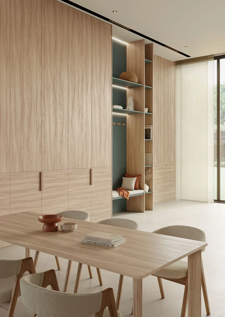 Estado de ánimo: serenidad estable. Un roble que baja pulsaciones y sostiene rutinas: sala de estar, dormitorio, zonas de lectura, hospitality que busca intimidad o viviendas donde la calidez no depende del color, sino de la temperatura visual y del tacto.