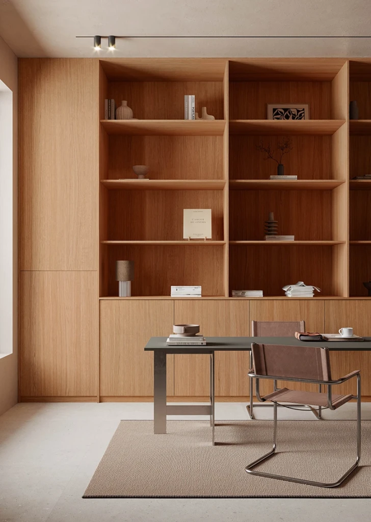 Estado de ánimo: foco y ligereza. La veta se lee con nitidez, la superficie no resulta demasiado llamativa y el espacio parece más claro. Funciona muy bien en oficinas serenas, proyectos minimalistas cálidos, viviendas donde manda la luz natural o interiores que buscan una sensación de orden sin perder materia.