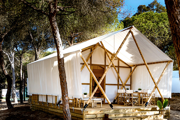 Los campings sostenibles, con presencia en España, Francia, Portugal e Italia, ofrecen una experiencia de alojamiento en medio de la naturaleza, en espacios protegidos y regulados, con las comodidades de un hotel. En la fabricación de las tiendas, que se realiza de manera artesanal en Sevilla, utilizan madera que proviene de Galicia, la cual cuenta con certificación Rainforest Alliance, es decir, tiene cero impacto en la tala.