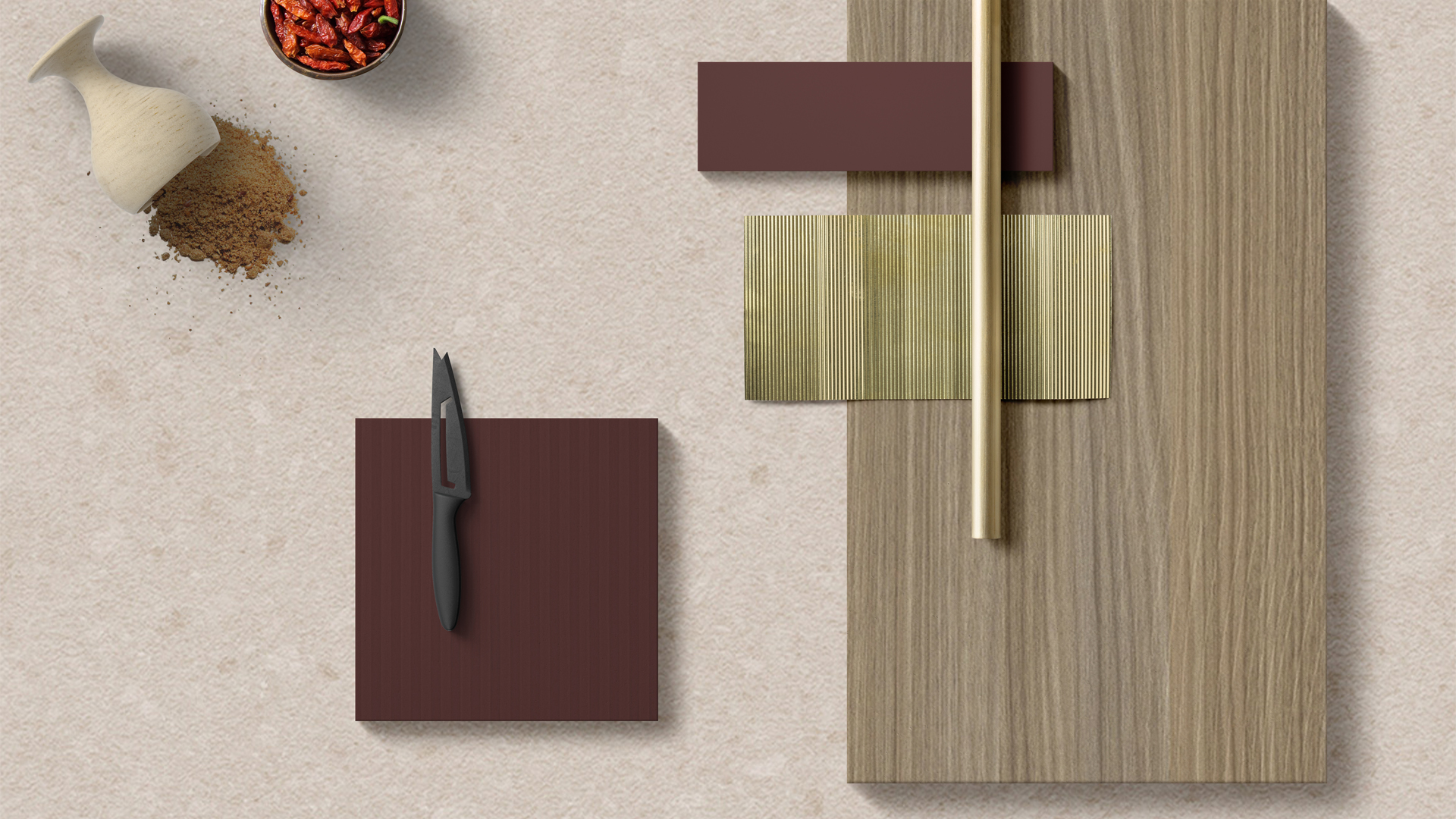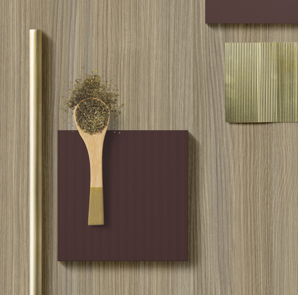 El tono rojo oscuro inspirado en las tonalidades de las pinturas rupestres 466B Rojo Tassili – Soft III, evocador de la fuerza de la naturaleza, se entrelaza con la pureza de la piedra en el 271B Gravity Hueso – Moa, creando una paleta que respira vida y tranquilidad. Este matrimonio cromático se ve realzado por las líneas verticales de la textura profunda en 466B Rojo Tassili – Calypso, aportando un toque de tendencia actual.