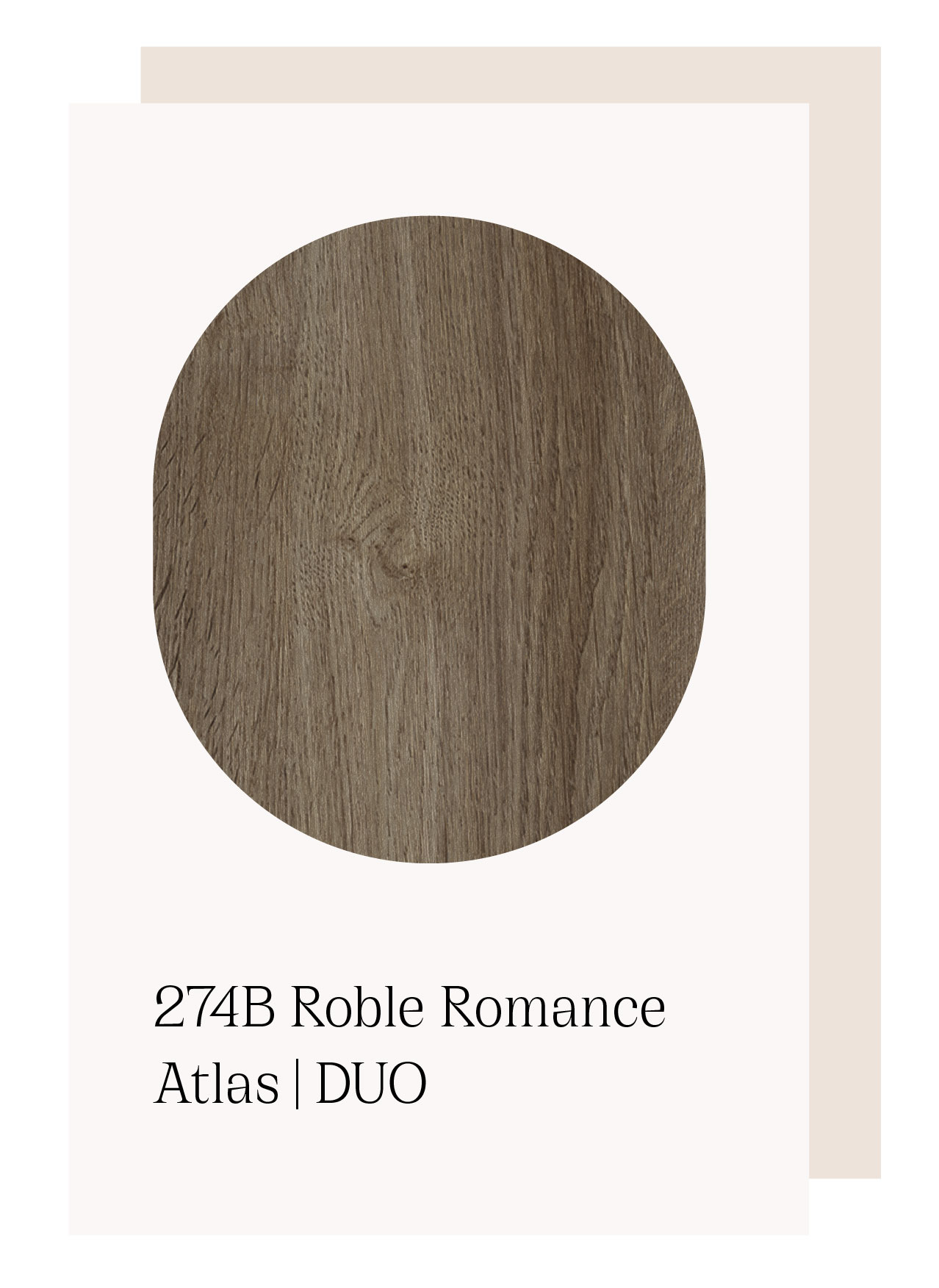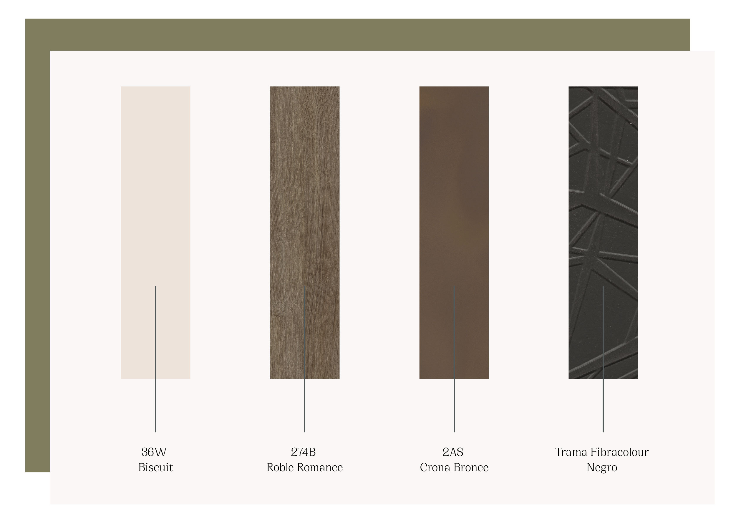En este moodboard aparecen los decorativos 36W-Biscuit-Soft III, 274B-Roble Romance-Atlas, 2AS-Corona Bronce-Moon y Fibracolour Negro E-Z Tex Trama.